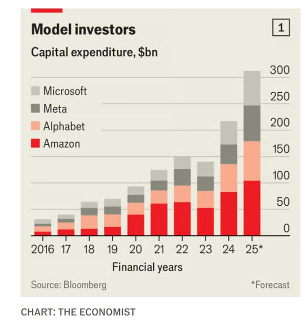 The investments of all big Western tech firms are soaring, driven largely by AI (see chart 1 from The Economist