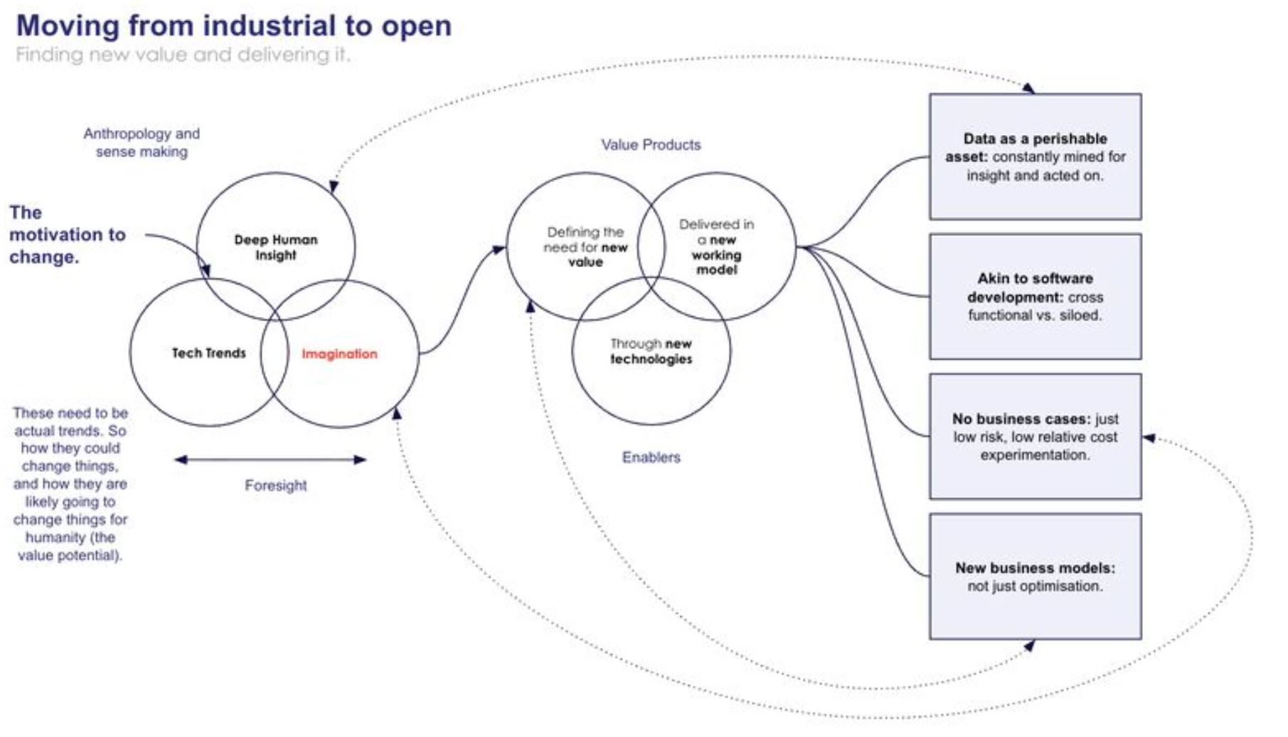 He calls for an ‘Imagination Economy’ to deliver new value, new business models and use cases. His visualisation of the process is spot on.