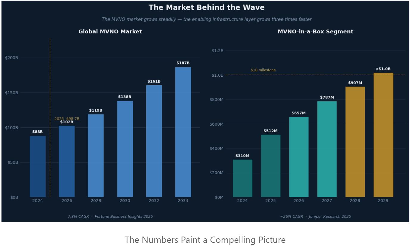The combination of MNOs, MVNOs, MVNE (enablers) now make ‘MVNO in a Box’ an innovation enabler. The growth rates from Junioer Research tell their own story.
